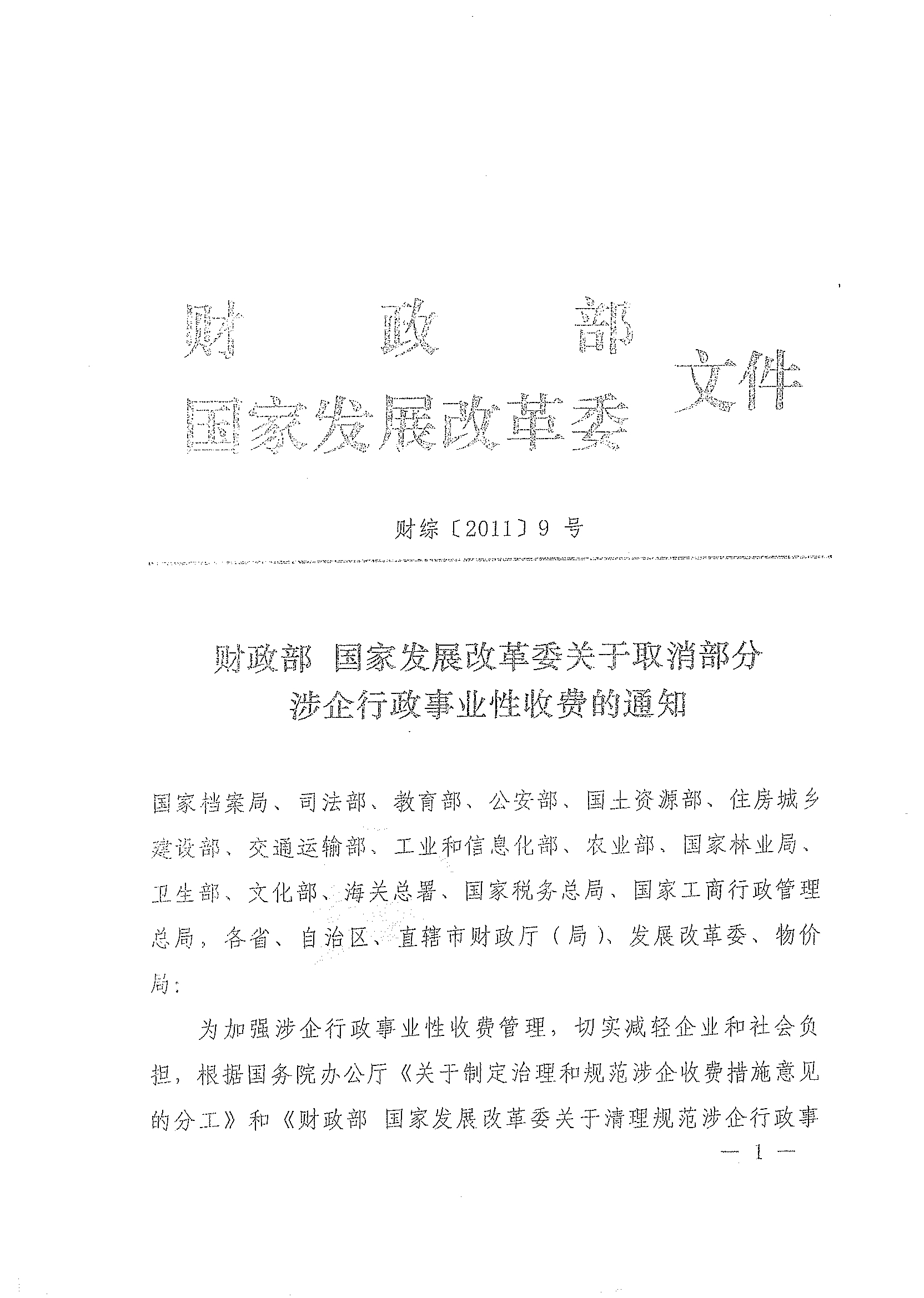 《財政部 國家發展改革委關於取消部分涉企行政事業性收費的通知》(財綜[2011]9號)