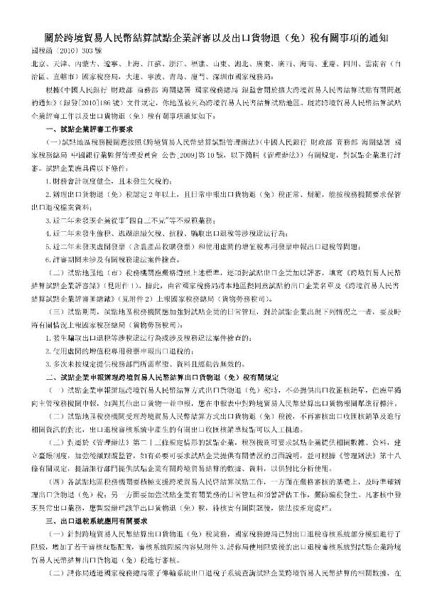 關於跨境貿易人民幣結算試點企業評審以及出口貨物退(免)稅有關事項的通知